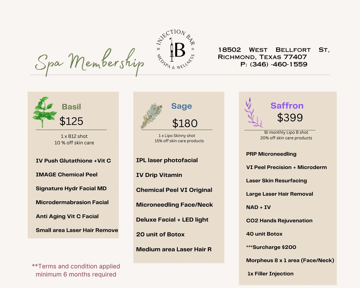 Membership cannot be combined with any other offers. Program has no monetary value. Services may not be combined. Program services cannot be transferred. Membership cancellation prior to commitment period will be charged the equivalent of 3 months service fee. Monthly services DO NOT rollover month to month, however, the amount paid may be banked for future use on services. Other restrictions may apply – see staff member for details. NO show to monthly member appointment forfeits monthly service for current month. We reserve the right to cancel or modify memberships at any time. 24 hour appointment cancellation allowed for members only. Failure to cancel within 24 hours will result in forfeiture of the monthly service. Payments not received by the 5th of the month will incur a $25 late fee.